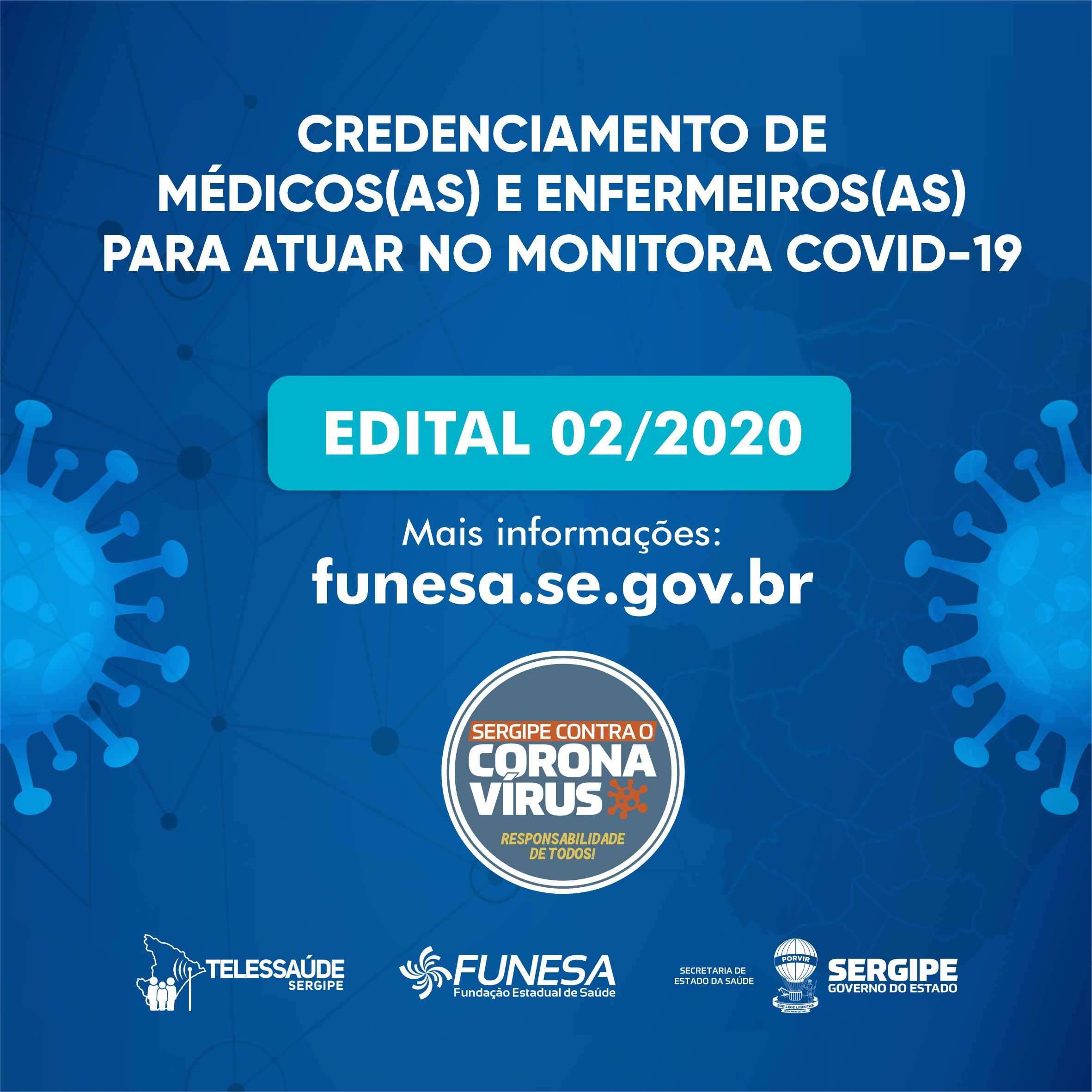 O Edital 02/2020 busca credenciar profissionais médicos(as) e enfermeiros(as), em caráter excepcional, para prestação de serviços autônomos, no âmbito do Programa “Monitora Covid-19 no Enfrentamento à Pandemia do novo Coronavírus (Sars-Cov-2)”, mediado pelo aplicativo Monitora Covid-19 – Sistema de Informação para Monitoramento da Pandemia do Coronavírus (covid-19), sob a supervisão da Secretaria de Estado da Saúde (SES), em parceria com a Fundação Estadual de Saúde (Funesa).