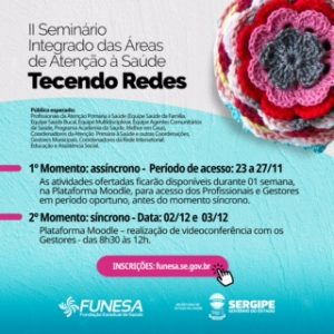 A Secretaria de Estado da Saúde (SES), através da Fundação Estadual de Saúde (Funesa), realizará o II Seminário Integrado das Áreas de Atenção à Saúde – Tecendo Redes, no período de 23 a 27 de novembro de 2020 – momento assíncrono, 02 e 03 de dezembro de 2020 – momento síncrono – transmissão ao vivo, ambos pela Plataforma EAD da Funesa (ead.funesa.se.gov.br).