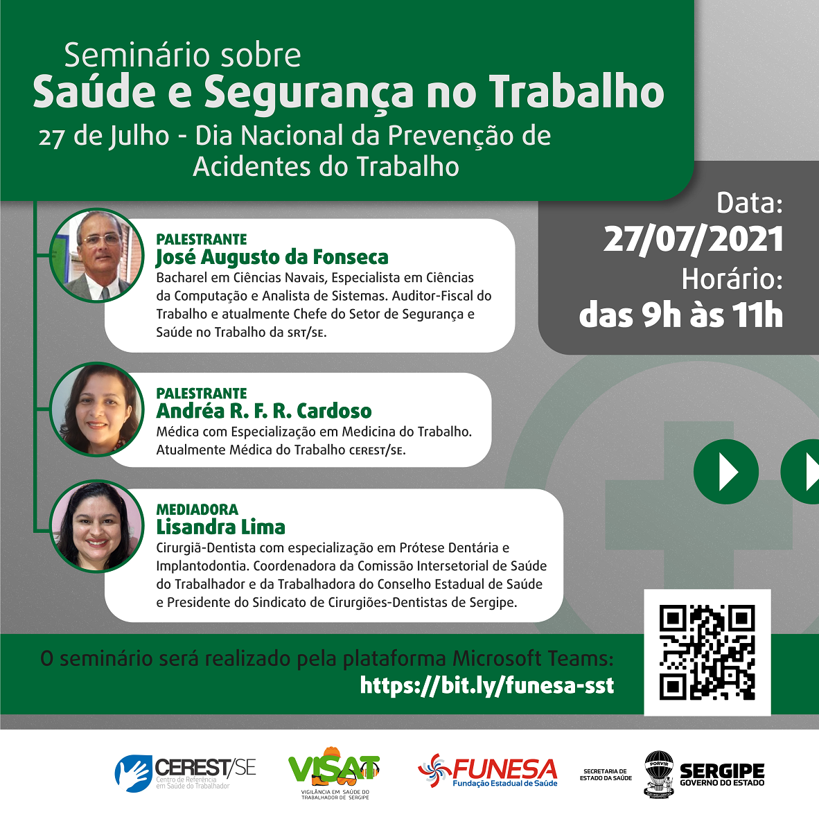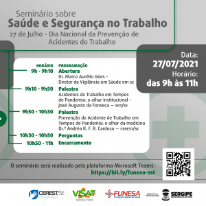 O Seminário acontecerá de forma remota, na plataforma Mconf, através do link https://bit.ly/funesa-sst , e será transmitido no YouTube, no canal Funesa Sergipe.
