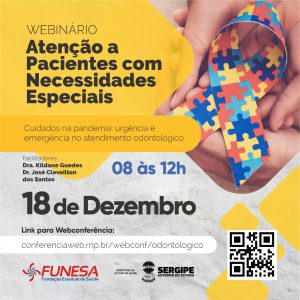 A Secretaria de Estado da Saúde (SES), em parceria com a Fundação Estadual de Saúde (Funesa), através da Coordenação de Educação Permanente e Pós-Graduação e da Coordenação dos Centros de Especialidades Odontológicas, realizará, nesta sexta-feira (18), o webinário “Atenção a pacientes com Necessidades especiais: Cuidados na pandemia – urgência e emergência no atendimento odontológico”, a fim de aprimorar o trabalho dos profissionais da assistência odontológica para atenderem pessoas com deficiência,além de promover o aperfeiçoamento do serviço realizado no SUS Sergipe.