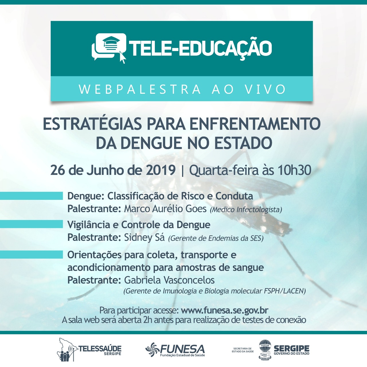 A Secretaria de Estado da Saúde (SES), o Telessaúde Sergipe e a Funesa convidam para a Tele-Educação “Estratégias para enfrentamento da Dengue no estado”.