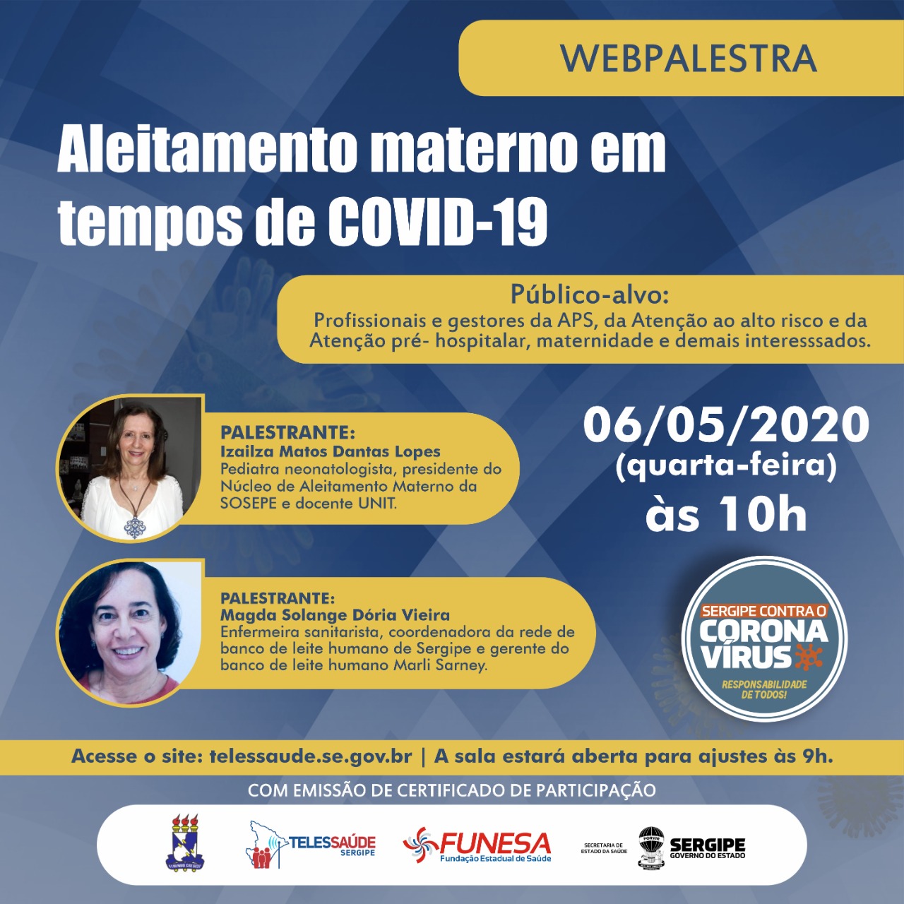 O objetivo do Telessaúde Sergipe é manter os profissionais de saúde atualizados sobre as situações do cuidado em saúde no território. Com a situação de pandemia mundial do novo coronavírus (Covid-19), a Secretaria de Estado da Saúde (SES) e a Fundação Estadual de Saúde (Funesa), através do Telessaúde Sergipe, promovem a webpalestra “Aleitamento Materno em tempos de covid-19”, a ser transmitida na segunda-feira, 6 de maio, às 10h.