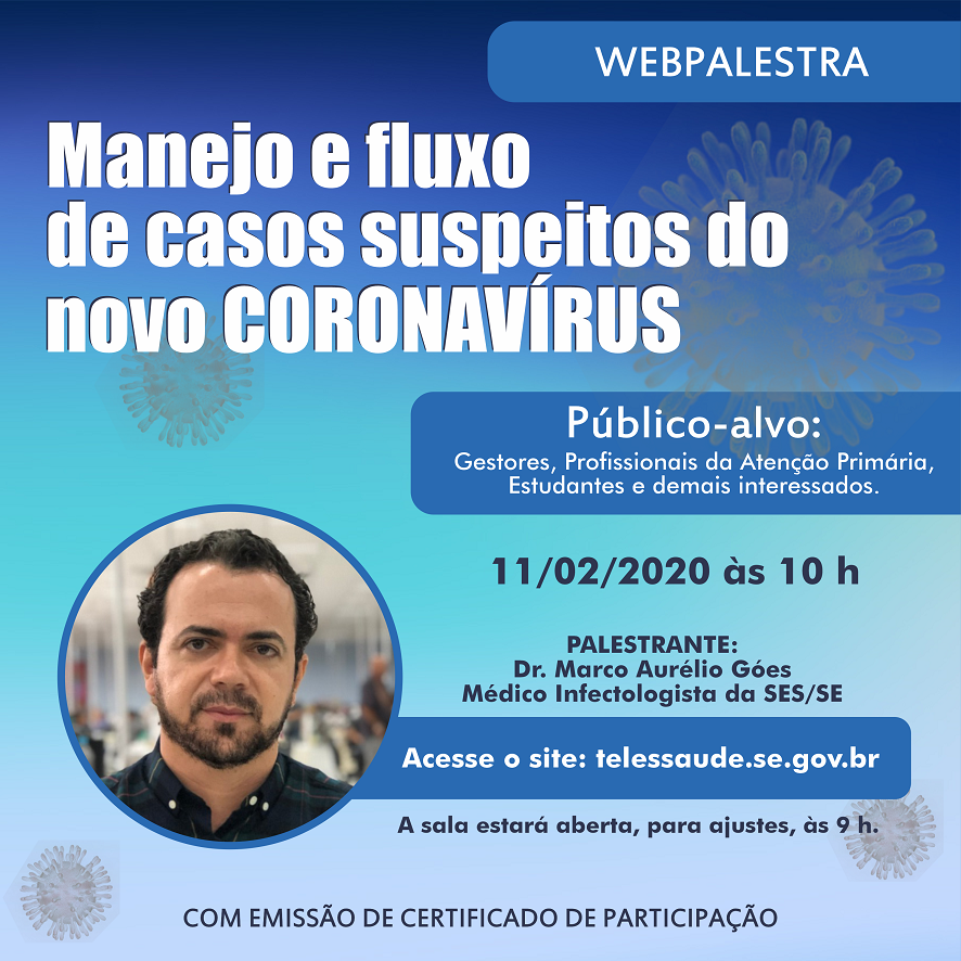 O objetivo do Telessaúde Sergipe é manter os profissionais de saúde atualizados sobre todas as questões do cuidado em saúde no território. Com o novo Coronavírus como situação de alerta mundial, a Secretaria de Estado da Saúde (SES) e a Fundação Estadual de Saúde (Funesa), através do Telessaúde Sergipe, promovem a webpalestra “Manejo e fluxo de casos suspeitos do novo Coronavírus”, a ser transmitida nesta terça, 11/02, às 10h.